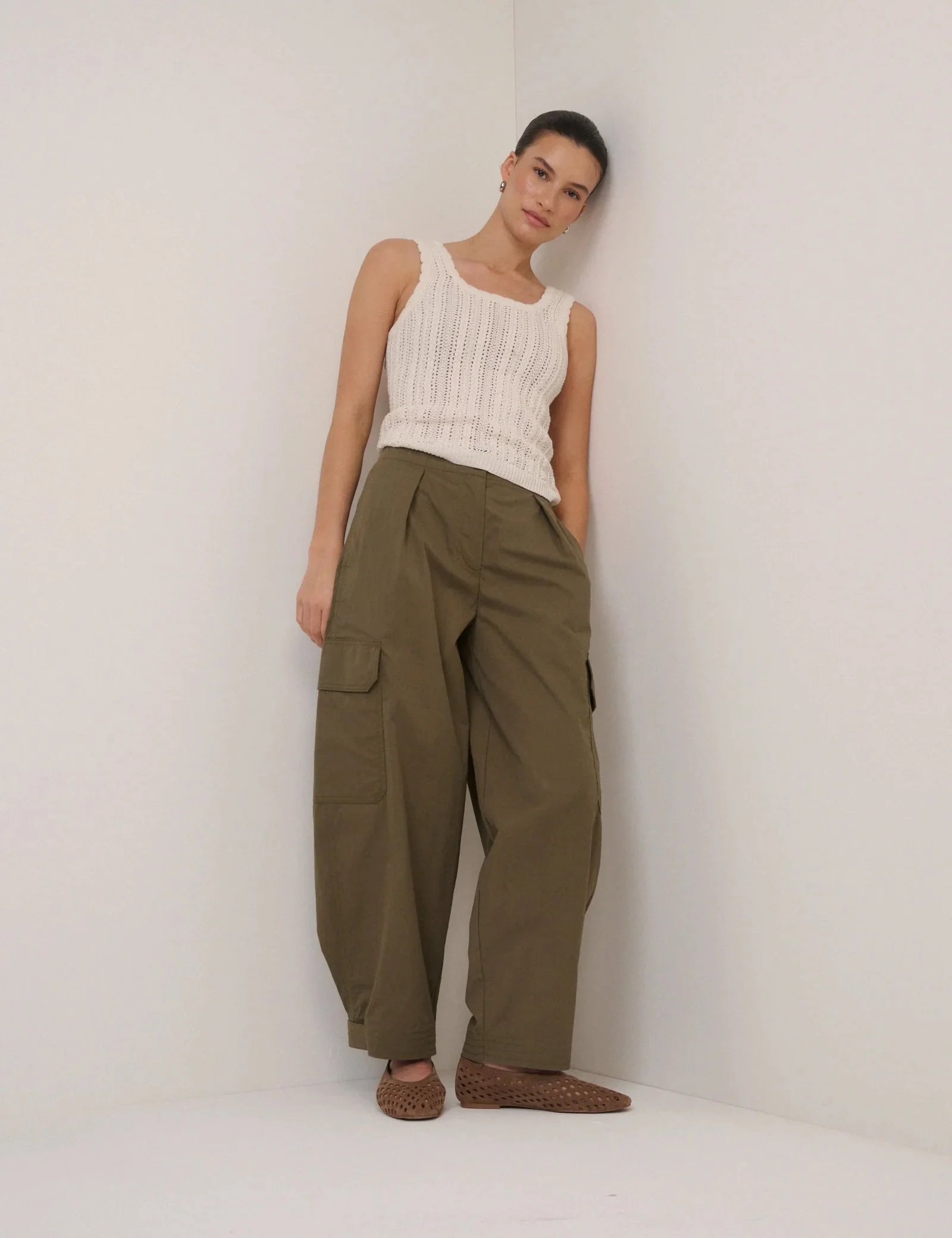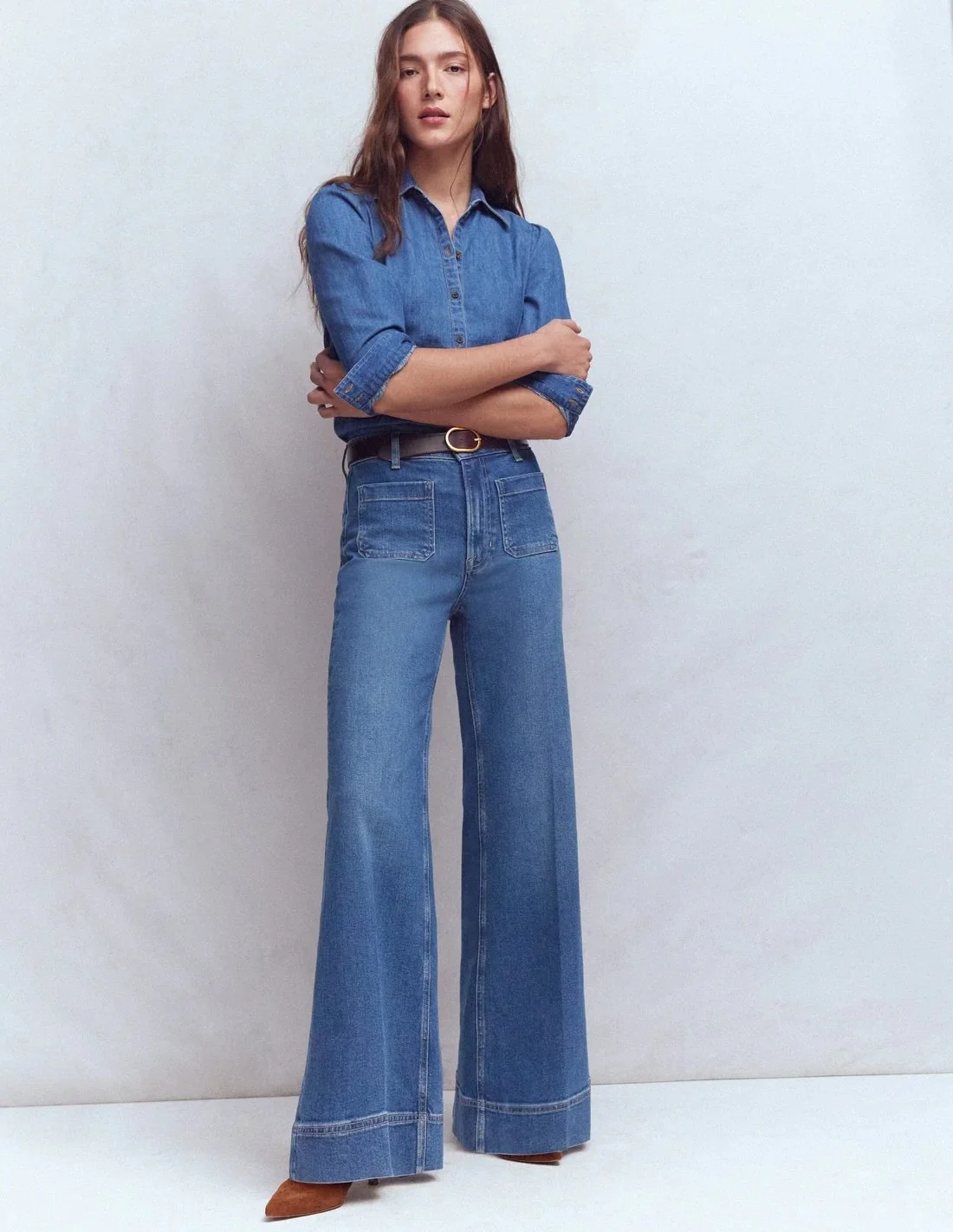 Select jeans and trousers in barrel leg or high-waisted wide leg cuts – current, leg-lengthening, and ideal for diverse body shapes like apple or long-waisted.