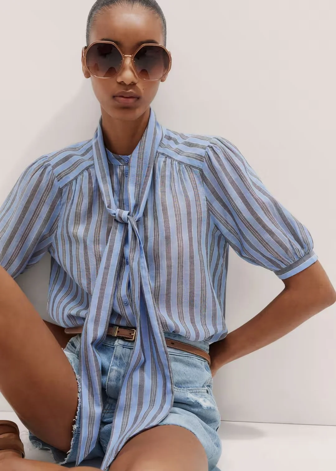 Add interest with a pussy bow blouse. I have this one and love wearing it with baggy jeans but it would work for a Summer office option too.