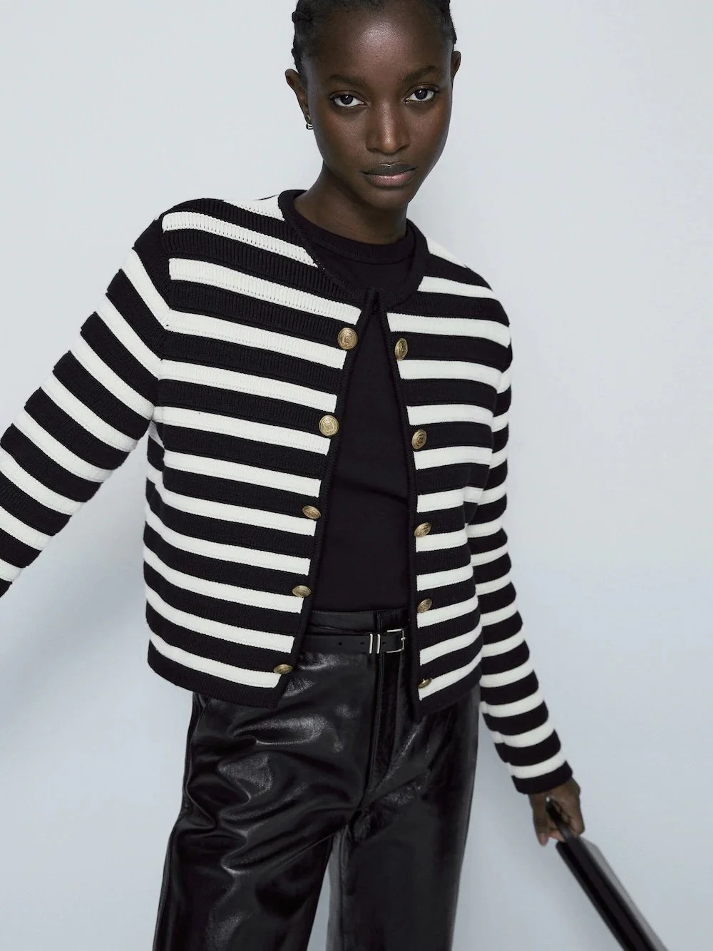 Smart is the key word here. In my opinion, if you want to look smart at work but don’t feel like wearing a tailored blazer some days then this is a great option. Maybe you’ve got a day where you are not seeing clients and can be a bit more casual. There are lots of slightly structured, cropped for boucle cardigans in the shops right now. Massimo Dutti has a few and check Zara too. Me & Em also have options.